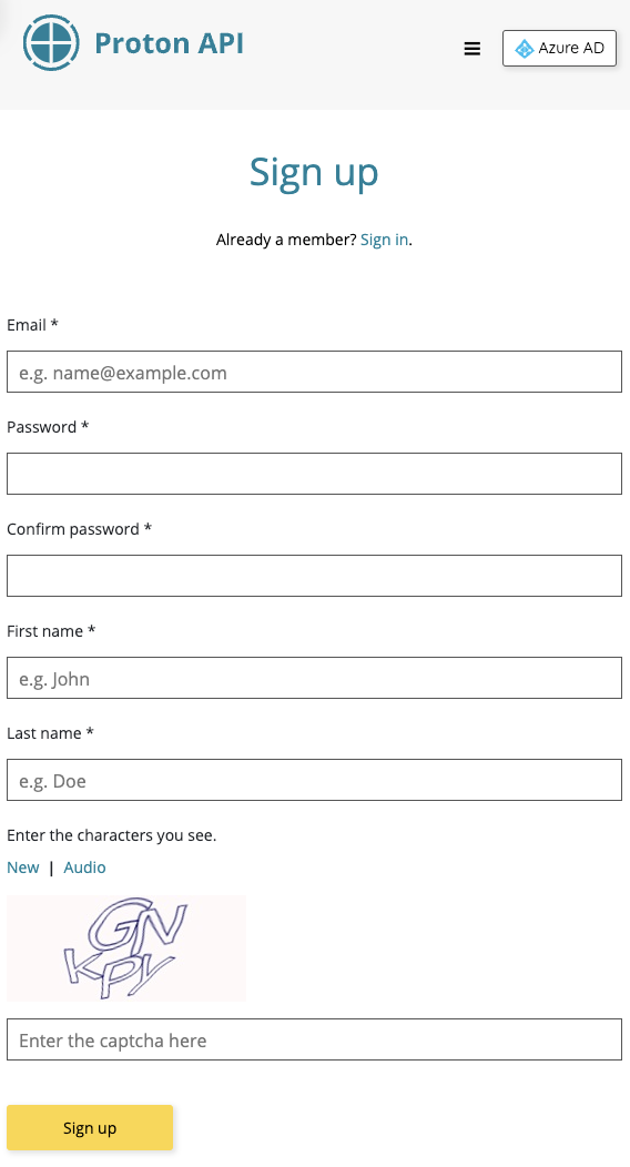 https://protonuat.developer.azure-api.net/signup (AAD or form)