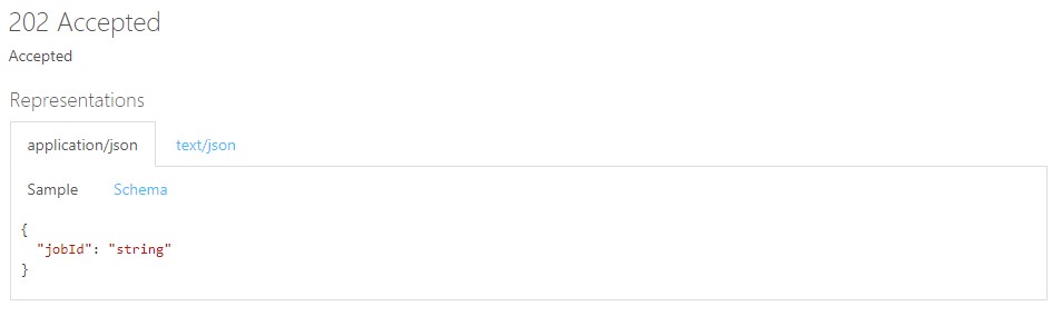 For some endpoints, the API response will be a jobId with 202 Accepted, instead of an entity: